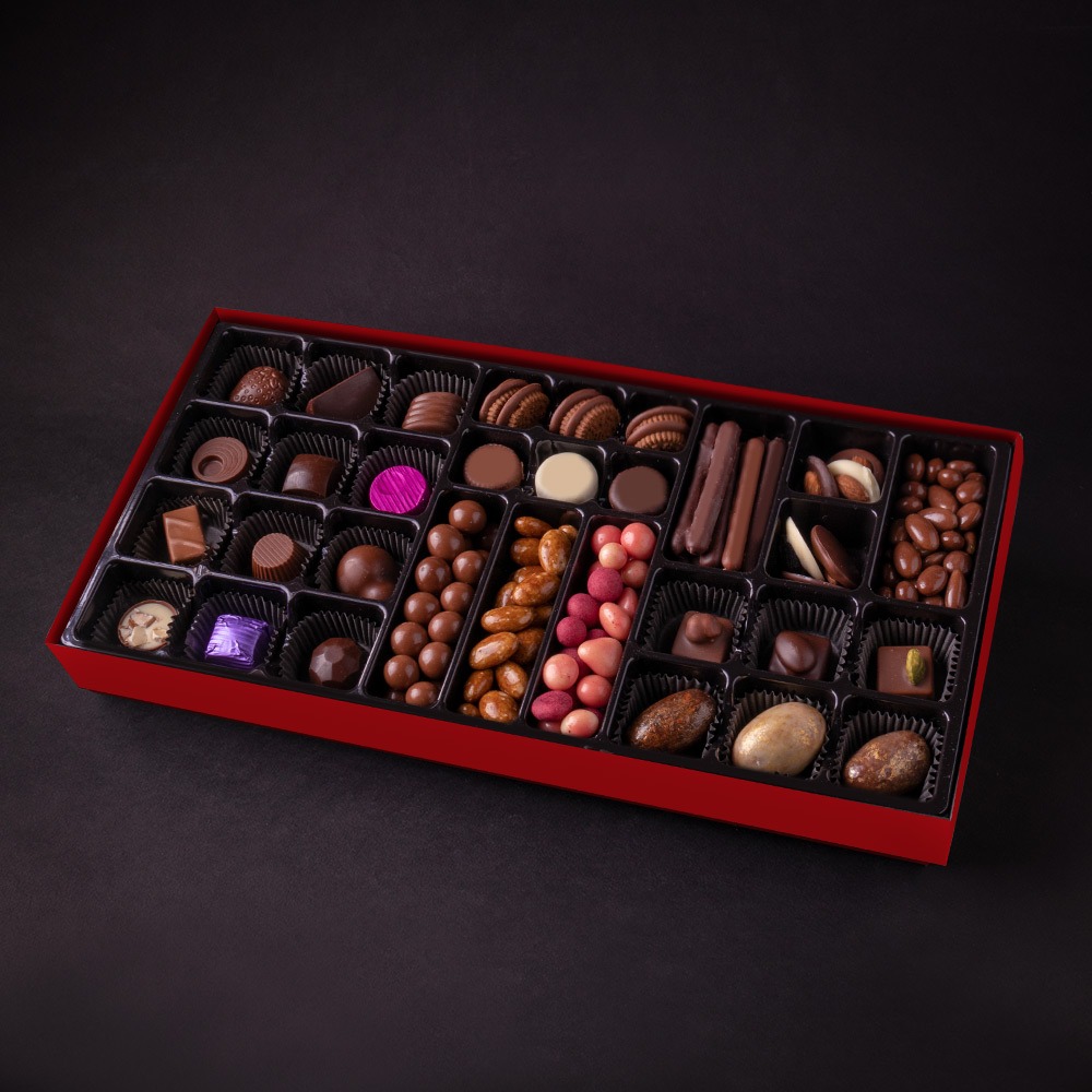 Discover a vibrant assortment of handcrafted chocolates, beautifully arranged in a red-trimmed box. With a mix of shapes, colors, and textures—from creamy centers to nutty toppings—this collection offers a delightful treat for every taste. Perfect for gifting or savoring solo.
