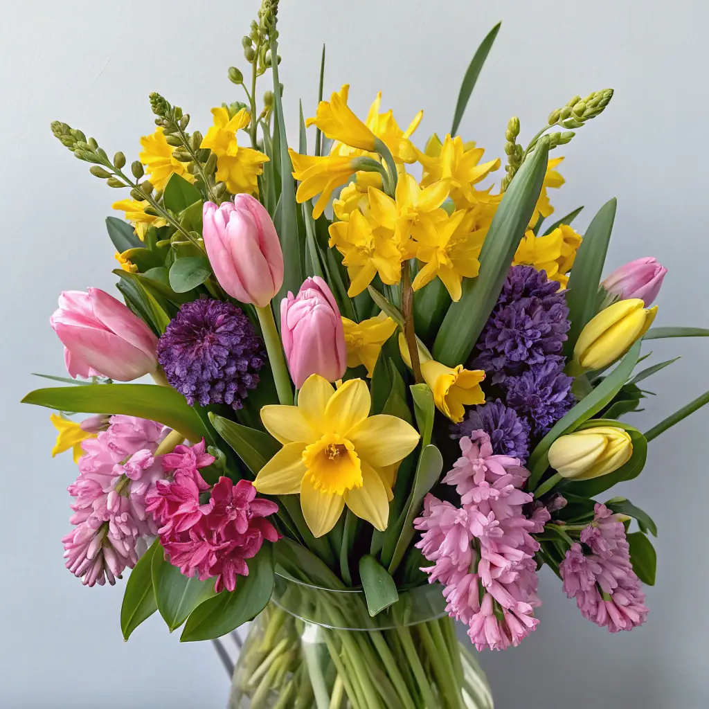 A lively arrangement of seasonal spring flowers, including tulips, daisies, and hyacinths. This colorful mix is perfect for celebrating new beginnings or cheerful occasions. The flowers are artistically arranged in a decorative bouquet with a variety of textures and hues. Suitable for delivery in Iran, bringing freshness and joy.
